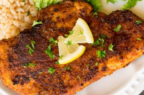 Pan Seared chicken breast seasoned w/ Cajun spices. Served w/ riced cauliflower & steamed broccoli.